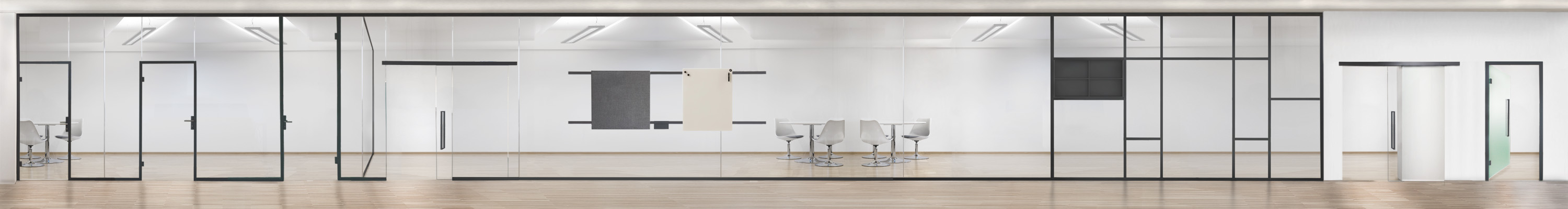 Die qi2 Wand ist ein doppelverglastes Trennwandsystem mit den höchsten Ansprüchen an Gestaltung, Transparenz und Akustik. Die Flächenbündigkeit der Profile über die grundhohe oder raumhohe Drehtür hinaus vermittelt die Leichtigkeit der Gestaltung. Wand und Tür lassen sich in eine Vielzahl von Konfigurationen und individuellen räumlichen Anforderungen einfügen.